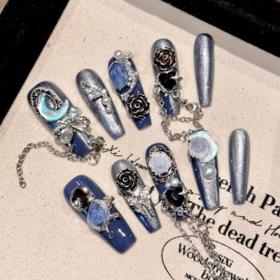 Punk Style Fake Nail Patches Dark Blue Handmade False Nails Metal Chain Flower Butterfly Press On Nails Wearable Manicure