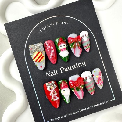 Handmade Press on Nails with Cute Santa Claus Snowman Design False Nail Patches Wearable Christmas Theme Almond False Nails