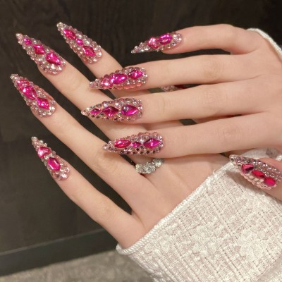 10pcs Full Diamond Handmade Press On Nails Long Stiletto False Nails With Flash Pitaya Color Rhinestone Decor Luxury Almond Nail