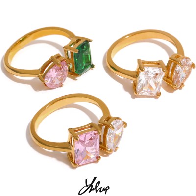 Yhpup Waterproof Fashion Stainless Steel Pink Green Cubic Zirconia Adjustable Open Ring Gold Color Unique Bling Charm Jewelry