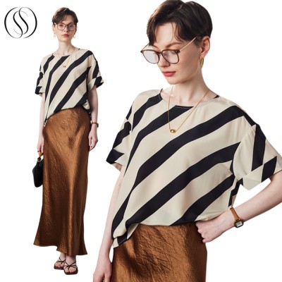 100% Silk 2025 Summer Women's Short-Sleeved T-Shirt Blouse White Black Stripe Ins Fashion Shirt Blouses Femme Women Tops Shirts