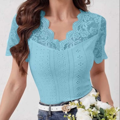 Women's Lace Colorblock V-Neck Short Sleeve T Shirts Tops Summer Ladies Basic Casual Pullover Blouse Tee Size S M L XL 2XL