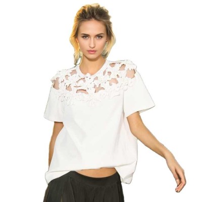 Crew-neck Embroidery Flower Stitching Design Sense of All the Hollow-out Short-sleeve T-shirt