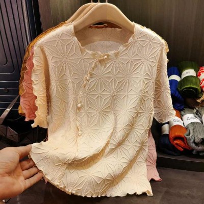 Chinese Style Button Embossed Pleated Top Slimming Casual Short Sleeve