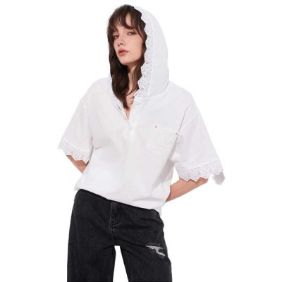 Summer New White Lace Hooded Short-sleeved T-shirt Women's Environmentally Friendly Knitted Tops Slim Tops