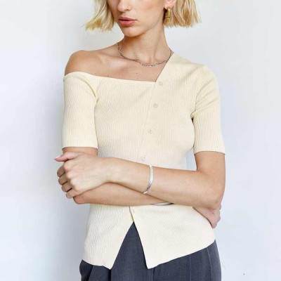 Elegant Beige Ribbed Knit Top for Women With Asymmetric Short Sleeves for Fall