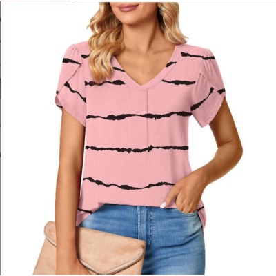 Summer Casual Printed Top with Loose V-Neck Petal Sleeve Short Sleeve
