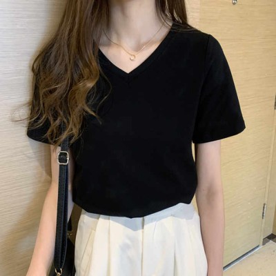 2025 Summer Women's Clothing Comfy Cotton Black V Neck T-Shirt Short-Sleeved Summer Slim Shirts Solid Color Knitted Shirt