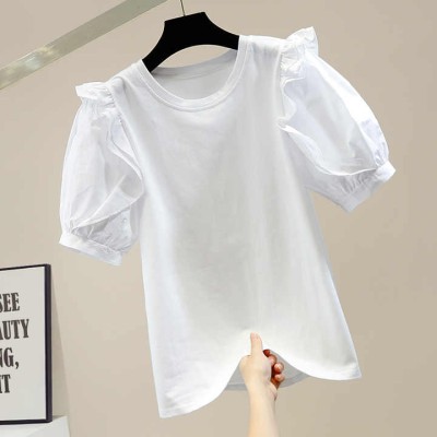 Retro Lantern Sleeve Sweet T Shirt Women's Pleated Wooden Ear Stitching T-shirt Female Fashion Round Neck Top