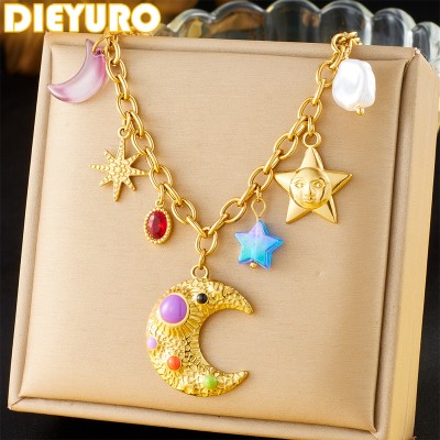 Colorful Enamel Moon Stars Multi Pendant Necklace