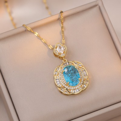 Luxury Ice Flower Big Oval Stone Pendant Stainless Steel Chains Necklaces For Women Blue Green Zircon Wedding Engagement Jewelry