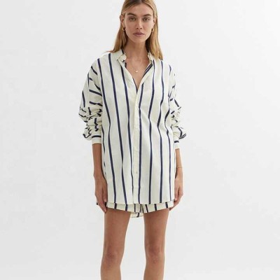 Women Long Sleeve Shirt for Women Button Down Pointed Collar Front Pocket Striped Oversized Shirt Fit With Shorts Set