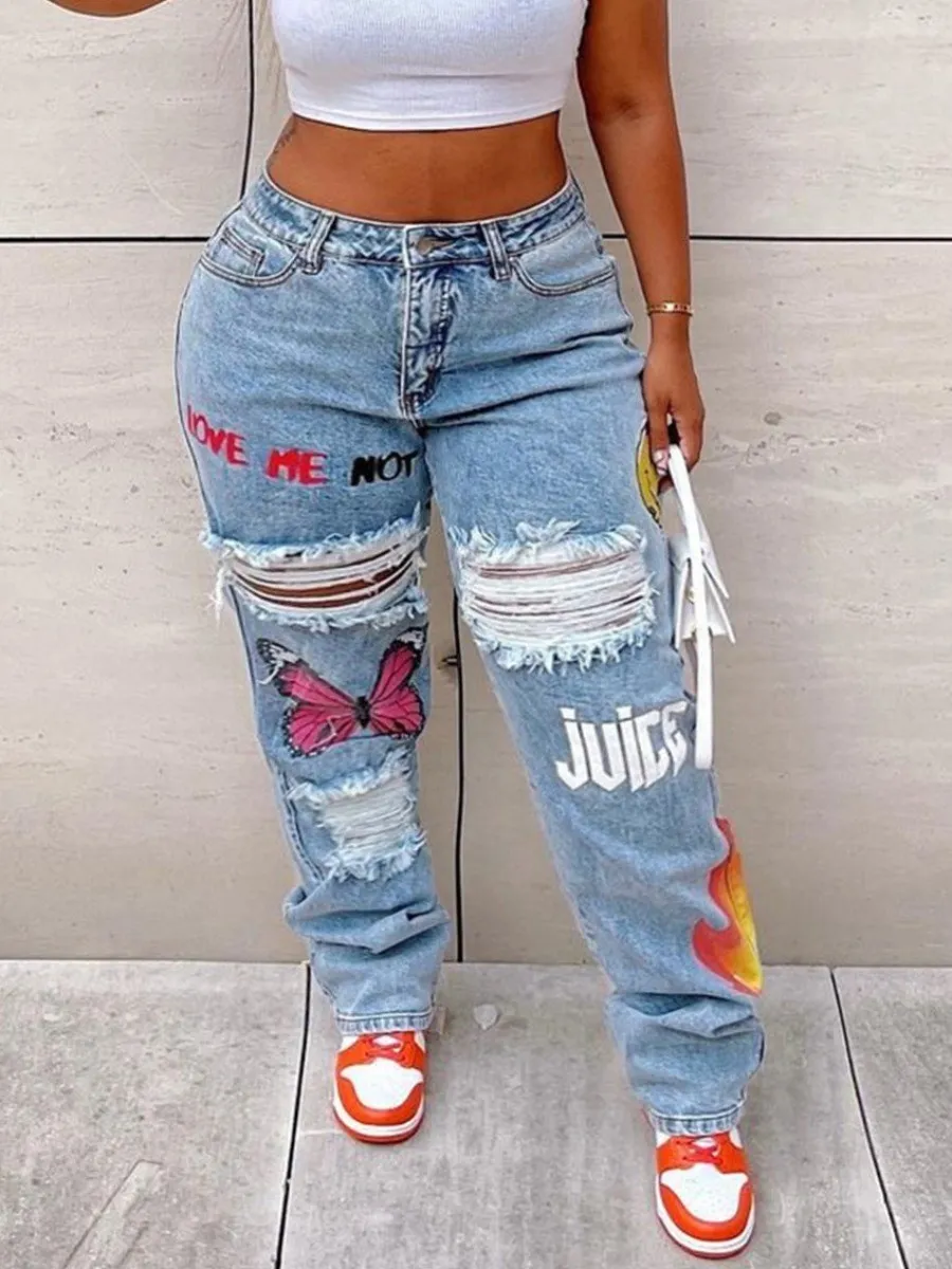 LW Plus Size Butterfly Letter Print Ripped Jeans Women Large Size Denim Fashion Straight Pants Streetwears Trousers(2 Colors)