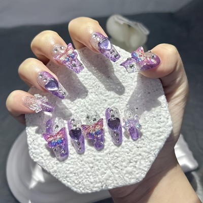 10 Pieces Purple Fantasy Butterfly Fake Nails Heart Diamond Sparkling Nail Art Patch Y2K Spice Girls Handmade Wearable Nails