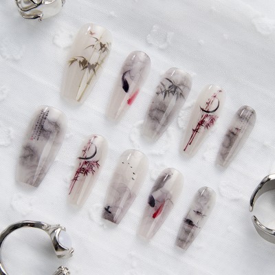 10PCS Chinese Fake Nails with Glue Sfumato Ink Koi Bamboo Design Long Press on Nails Set Acrylic Nail Tips Stick on for Women