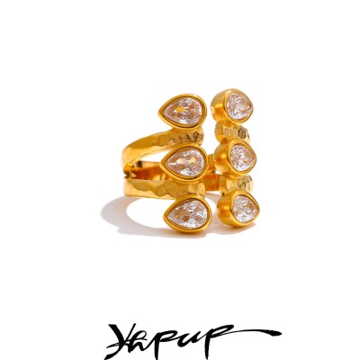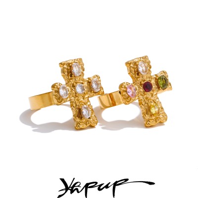 Yhpup Vintage Colorful Cubic Zirconia Cross Open Adjustable Golden Ring Stainless Steel PVD Plated Trending Finger Jewelry Gift