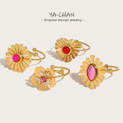 YACHAN Luxury Pink Natural Stone Stainless Steel Rings for Women Geometric Heart Flower Charming Chic Jewelry