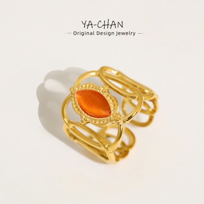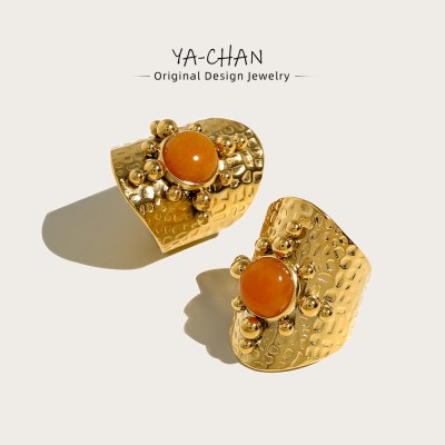 YACHAN 18K Gold Plated Stainless Steel Wide Ring for Women Luxury Orange Stone Metal Texture Trendy Aesthetic Jewelry