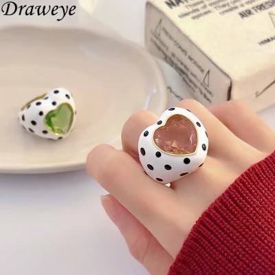 Draweye Korean Fashion Sweet Rings for Women Polka Dot Heart-shaped Cute Anillos Mujer Glaze Vintage Elegant Cuff Jewelry