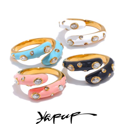 Yhpup Adjustable Candy Y2K Blue White Black Pink Enamel Cubic Zirconia Exquisite Open Ring Golden Stainless Steel Jewelry Gift