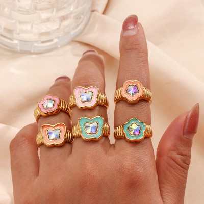 E.B.belle Cute Girl's Stainless Steel Zirconia Stone Pink Green Orange Flower Butterfly Ring Y2K Gold Jewery Rings For Women
