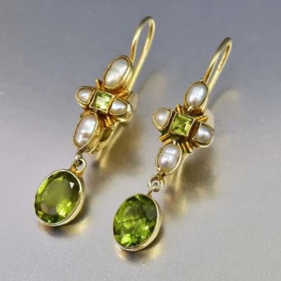 Dazzling Round Geometry Gold Color Earrings for Women Metal Inlaid Green Stone Imitation Pearl Earrings Jewelry