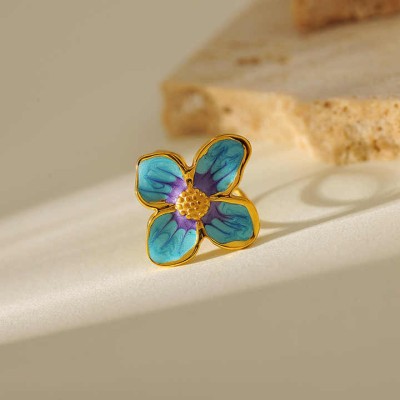 Fashion Jewelry Blue Enamel Stainless Steel Colorful Flower Ring Women Bohemian Open Rings Gift