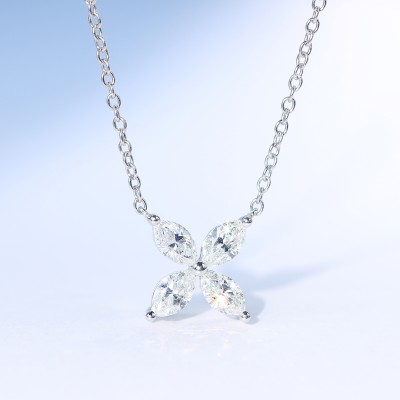 Sterling Silver Full Zircon Shiny Four Leaf Grass Lucky Flower Necklace