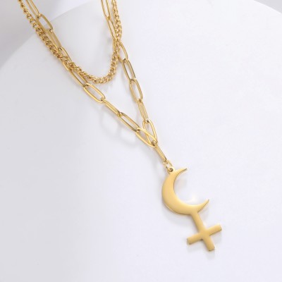 Fashion Women's Necklace Moon Cross Pendant Necklace Stainless Steel Double Layer Necklace Trend Jewelry for Party Gift