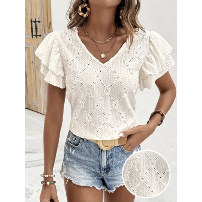 Womens T Shirt Short Sleeve Women Fashion Solid Embroidered Casual V Neck Lace Patchwork Shirt Hollow Out Top for Ladies