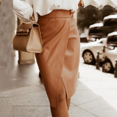 Women Leather Skirt Midi High Waist Elegant Autumn Zipper Pu Front Slit Skirts Ladies Black Faux Leather Folded Skirt For Women