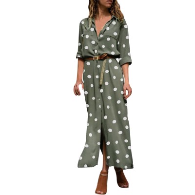 Summer Polka Dot Print Maxi Dress Women's Button Up Split Flowy Shirt Long Dresses Slim Long Sleeve Shirts Dresses With Belt