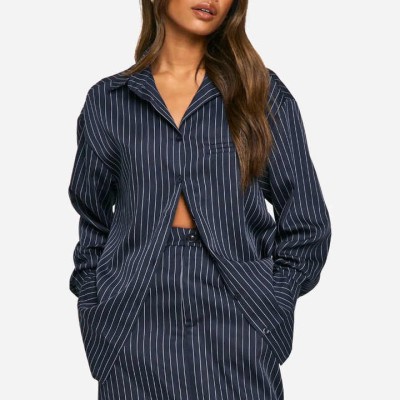 Women Long Sleeve Shirt for Women Button Down Pointed Collar Front Pocket Striped Oversized Shirt Fit With Shorts Set
