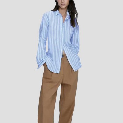 Cotton Linen Striped Shirts Casual Long Sleeve Blouses for Women Ladies Drop Shoulder Button up Comfortable Shirt Tops