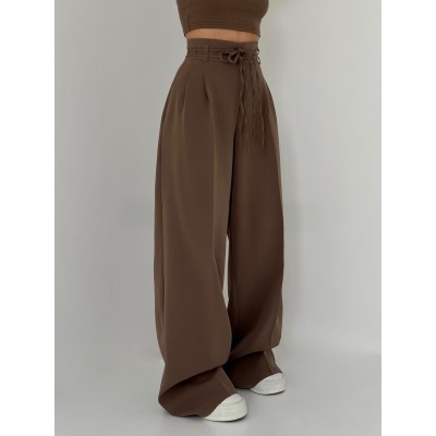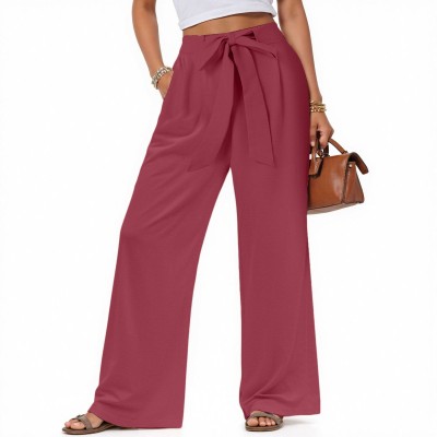 Women Wide Leg Pants With Adjustable Waist And Knotting Flowing And Loose Casual Pants With Pockets