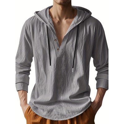 Men's Lightweight Linen Hooded Henley Shirt Casual Long Sleeve Button-Up Drawstring Solid Color
