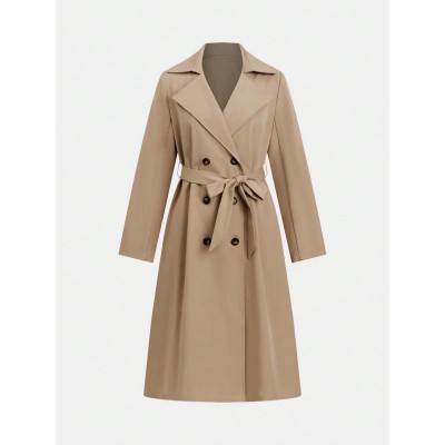 double breasted waist cinched British style mid length long sleeved windbreaker jacket