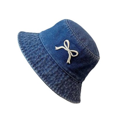 Casual Fisherman Style Bucket Hats for Unisex Wide Brim Cotton Denim Jean with Embroidered Bow
