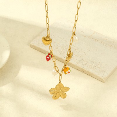 Vintage Stainless Steel Flower Heart Pearl Starfish Charm Necklace For Women Waterproof Clavicle Chain