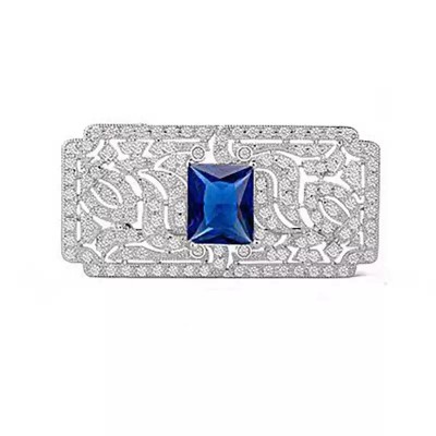 Art Deco Square Brooch Pin: Silver Color Geometric Lapel Pin with Sapphire Blue Rhinestone, Vintage Gift for Women