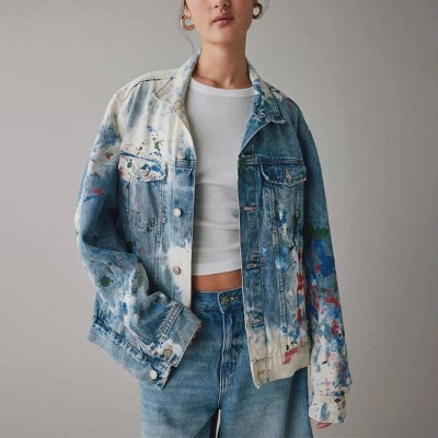 Acid Wash Painted Women's Denim Jacket Single Button Closure Cotton Filled with Printed Pattern for Autumn Season